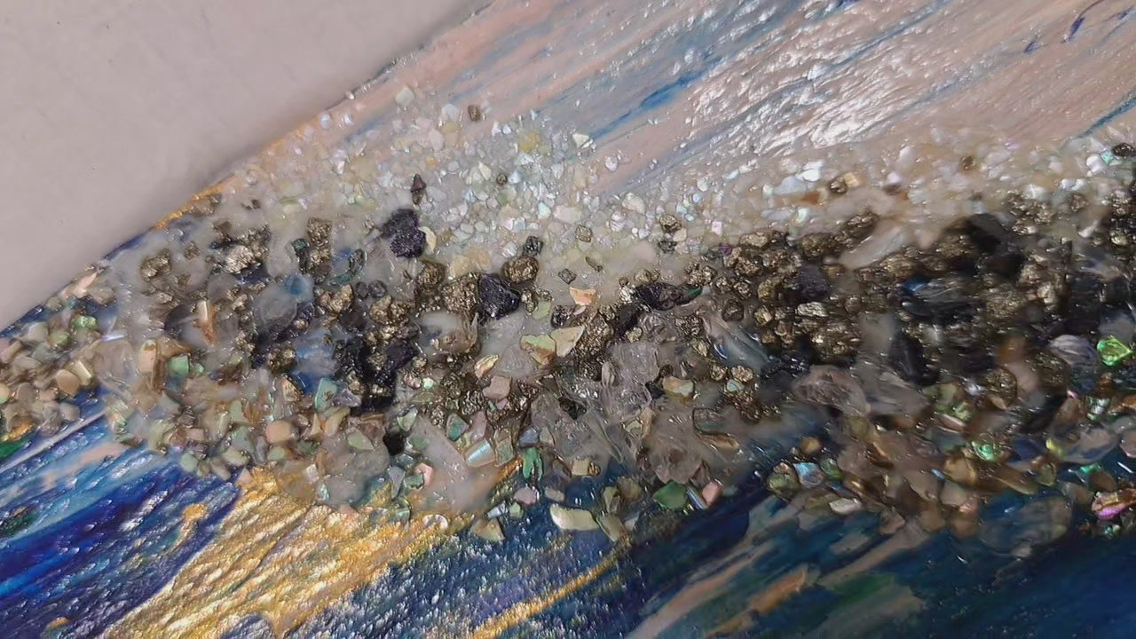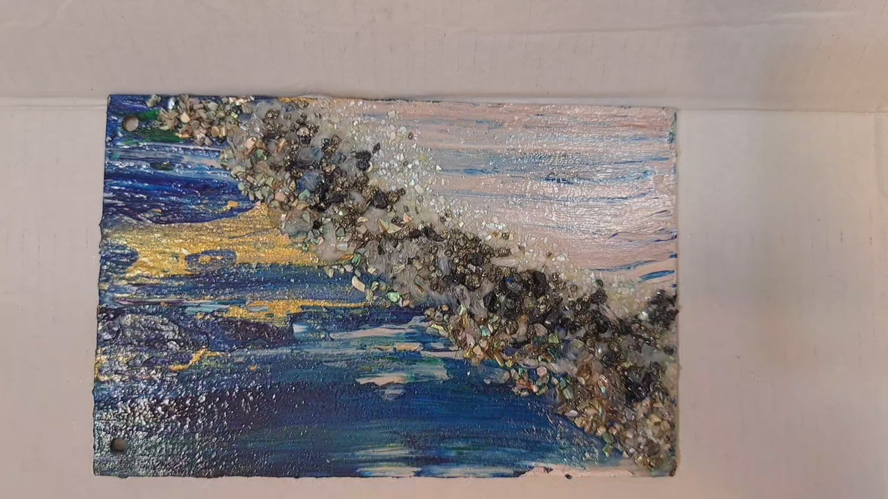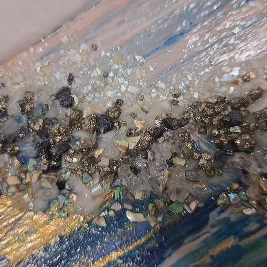 Acrylic, self level medium, quartz, bluestone, carborundum, pyrite, mother of pearl, & abalone on birch wood panel.