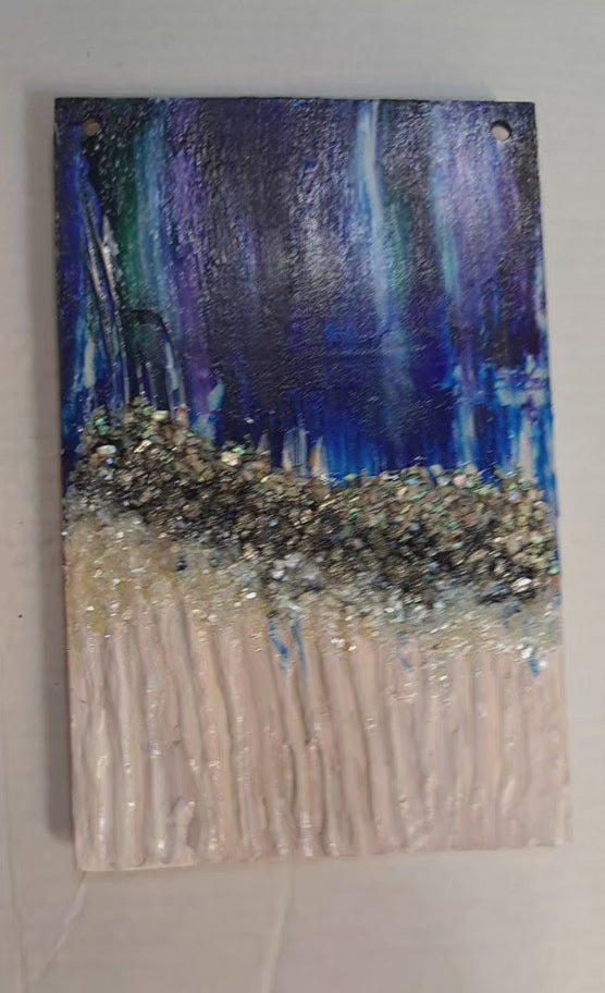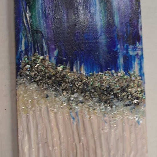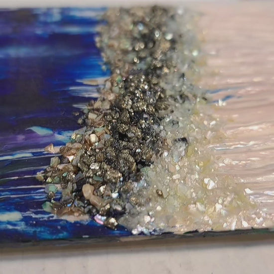 Acrylic, quartz, carborundum, bluestone, pyrite, mother of pearl, & abalone on birch wood panel.