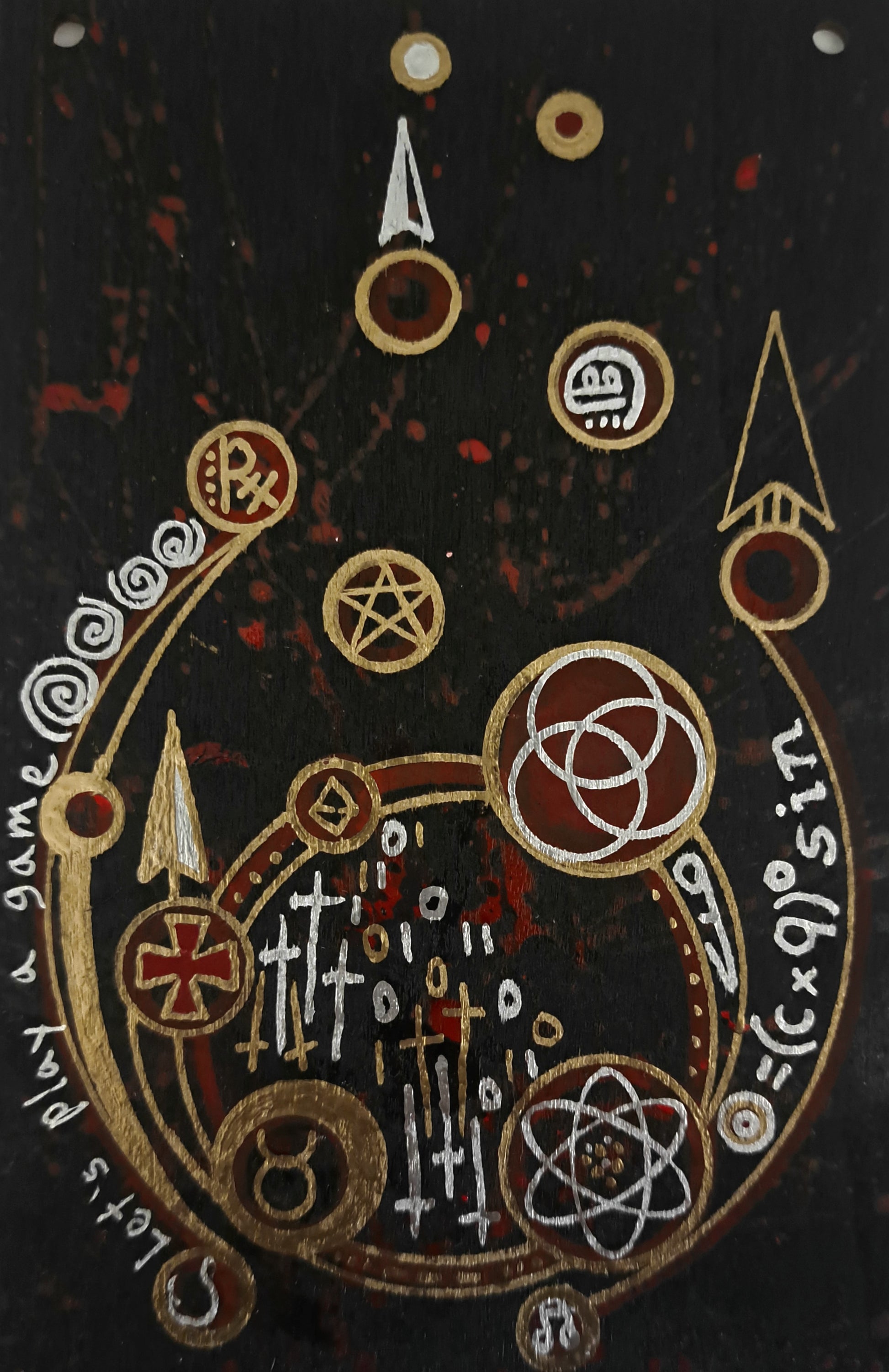Posca & Pilot (gold, silver) pens, acrylic on wood panel.