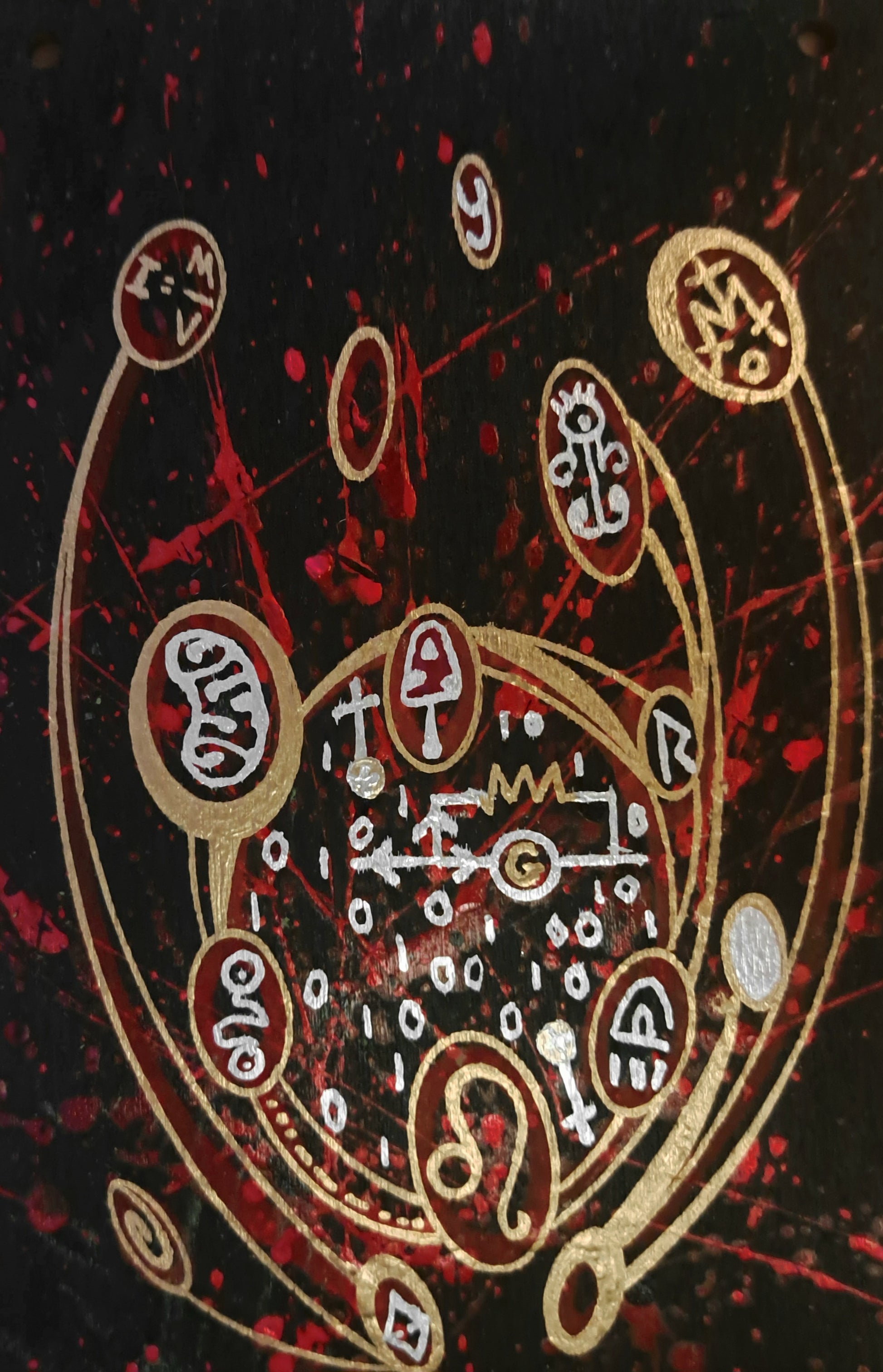 Posca & Pilot (gold, silver) pens, acrylic on wood panel.