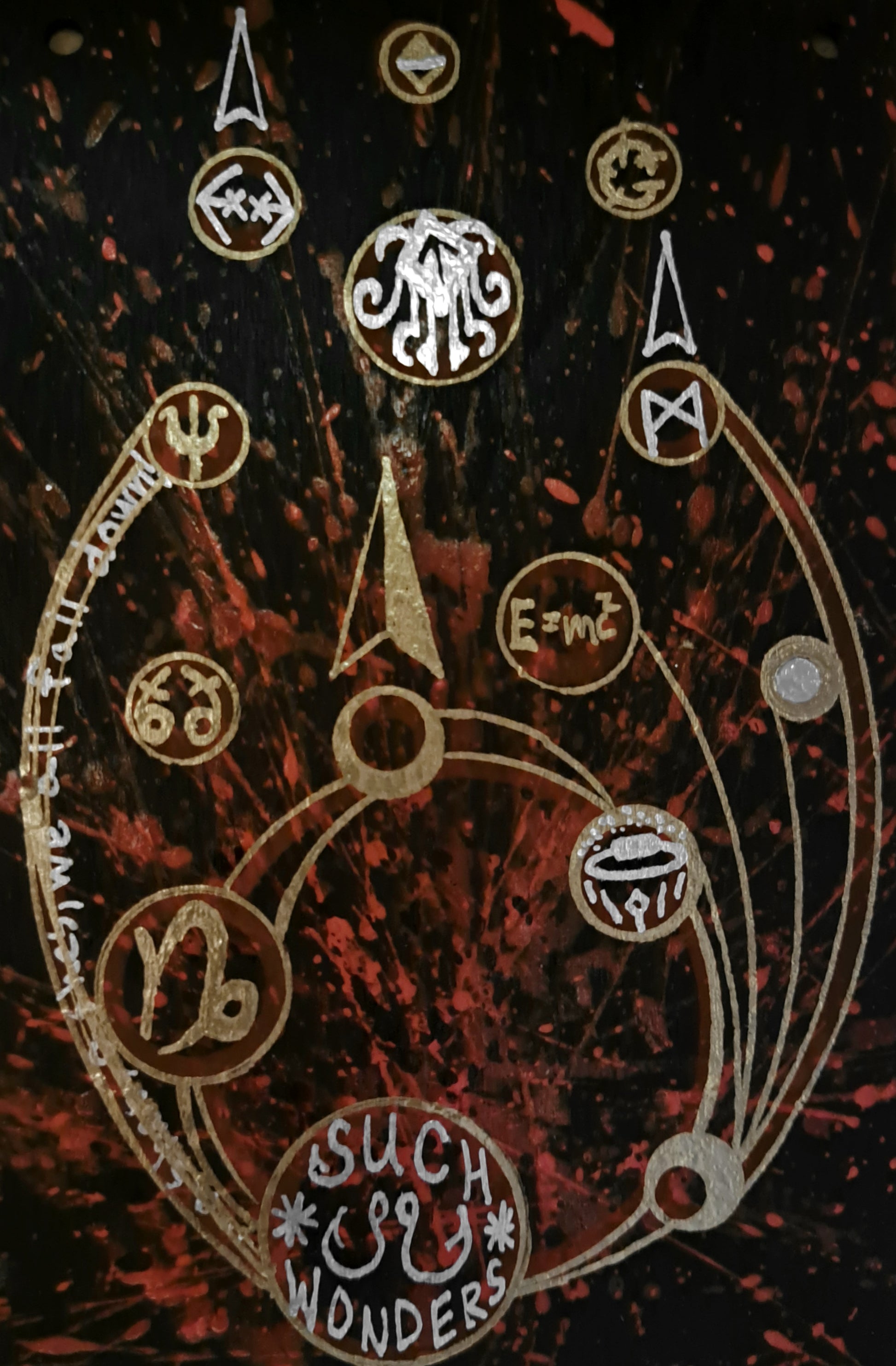 Posca & Pilot (gold, silver) pens, acrylic on wood panel.