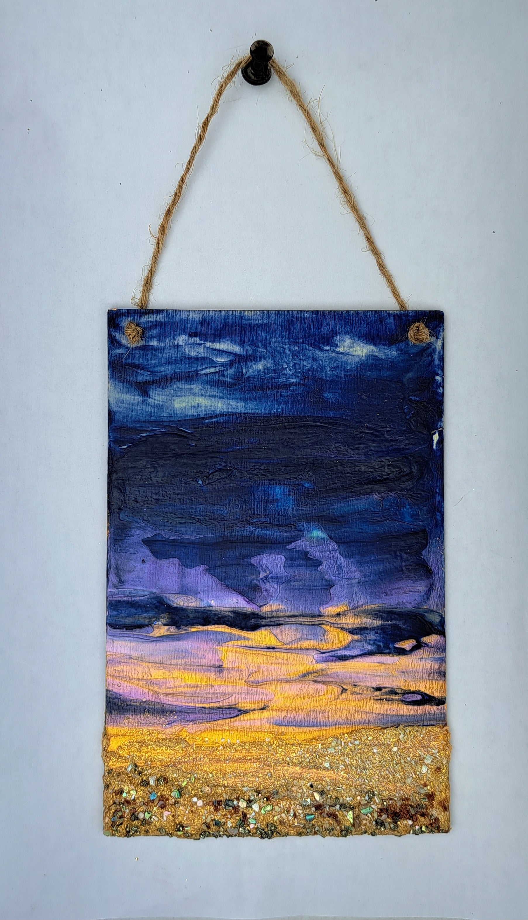 Acrylic, mica powder, sand medium (embedded with: goldstone, pyrite, mother of pearl shell, abalone shell) on birch wood panel.