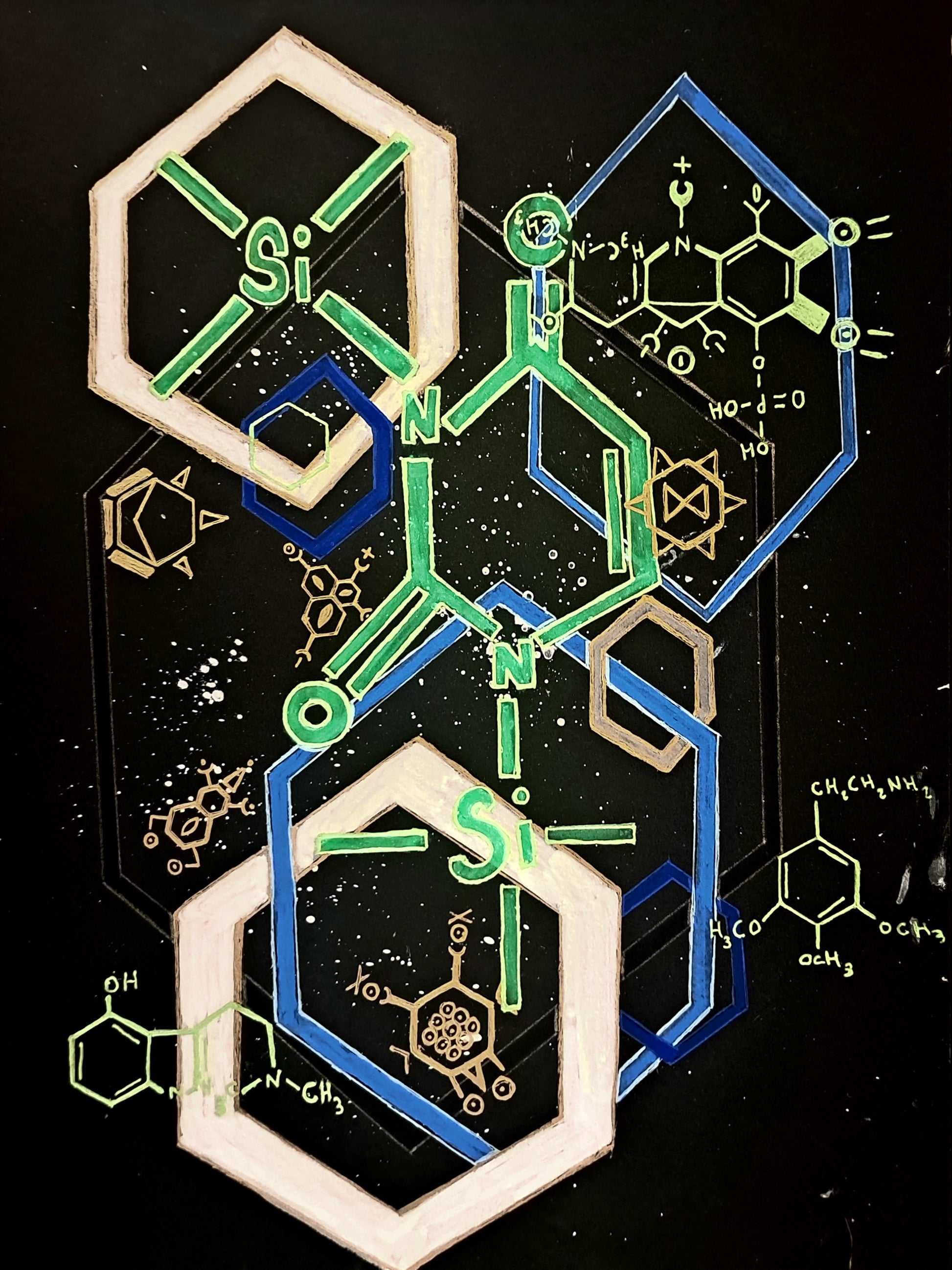 Gel ink, uv ink and oil pen on paper.